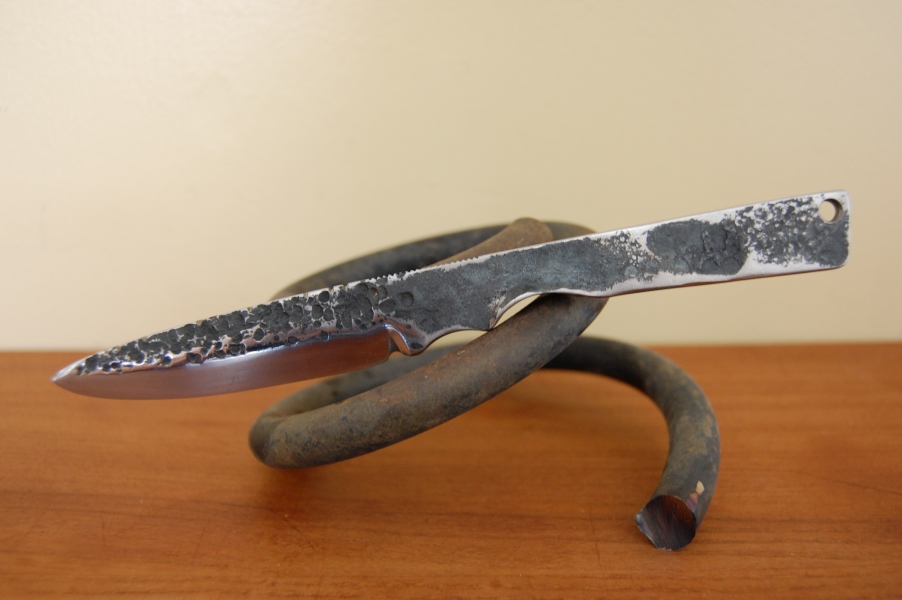This is the knife sitting on a piece of the spring that it was made of. In this picture, the knife is shaped but not yet hardened and tempered.