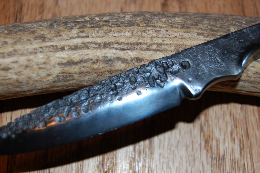 Very nice knife, I just started smithing myself and love it. I have made a couple blades and am planning to use antler for handles. I like the hammer with a texture idea, I may have to borrow that one myself in the future.