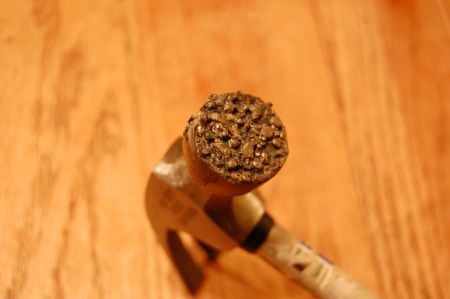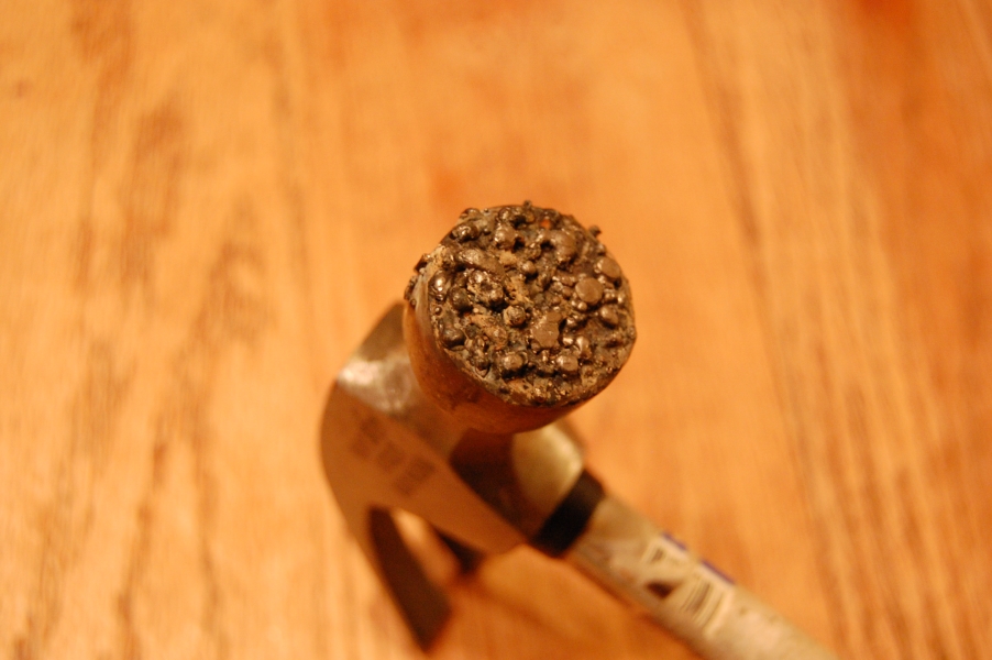 I wanted the knife to look like the steel had been lying on an abandoned barn floor in Montana for 50 years. Unfortunately, the blank my friend roughed out from the spring was smooth and straight. A few minutes with a fifty cent garage sale hammer and a welder came up with this texturing hammer: